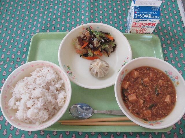 11月1日 牛乳 麦ご飯 多菜包子 こんにゃく入り中華サラダ 麻婆豆腐