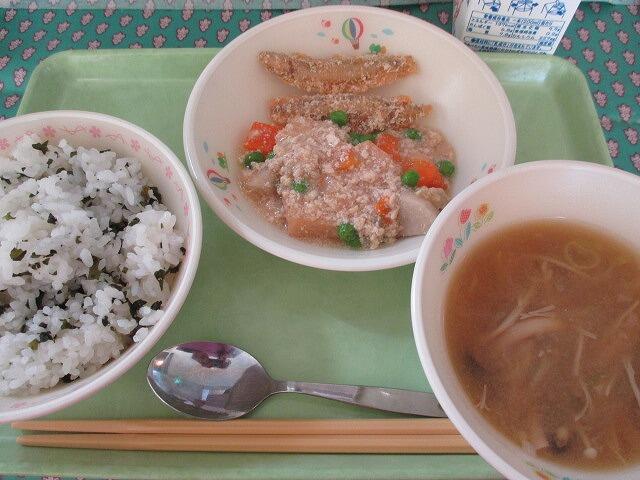 10月13日 牛乳 わかめご飯 きびなごのフライ(2本) 里芋と生揚げのそぼろ煮 きのこの吹き寄せ汁