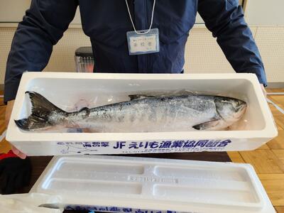 今日の鮭は北海道でとれた鮭です。鮭にもいろいろな種類があります。皆さんは切ってある鮭はよく見ているかもしれませんが,実際一匹をみたことがありますか?