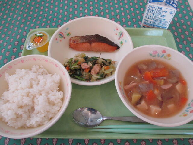 2月1日 牛乳 ご飯 鮭の照り焼き 野菜のごま昆布和え めった汁(さつま芋の豚汁) ひとくちみかんゼリー