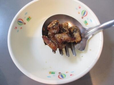 鰯の蒲焼きの目安量です。中学校はこれより少し多めに盛り付けられます。ご飯と混ぜて食べてください。