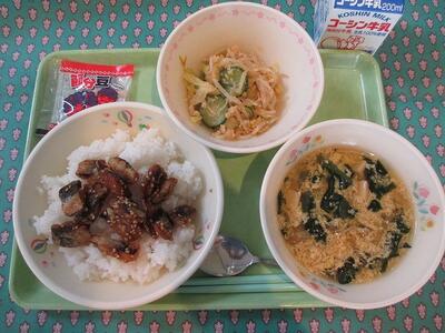 2月2日 牛乳 鰯の蒲焼きご飯(ご飯・鰯の蒲焼き) 蒸し鶏と野菜の和え物 かきたま汁 節分福豆