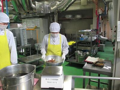 きな粉揚げパンは給食センターで1つずつ大きな揚げ物の機械で揚げたあと,手早くきな粉をまぶしています。今日は4400個の揚げパンを作りました。