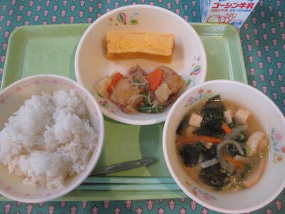 牛乳、ご飯、厚焼き卵、肉じゃが、柏野菜の味噌汁