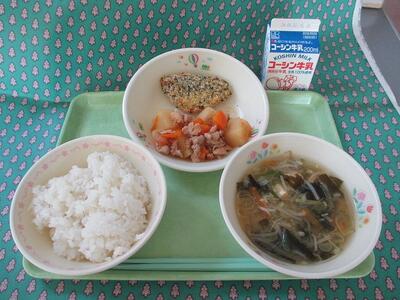 5月22日 牛乳 ご飯 鰺のチーズパン粉焼き 鶏じゃが 白いんげん豆の味噌汁