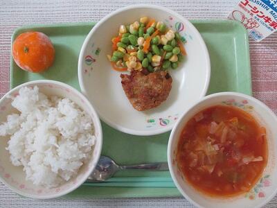 6月25日 牛乳 ご飯 タンドリーチキン(ごま入り) 枝豆とコーンのサラダ ミネストローネスープ 冷凍みかん