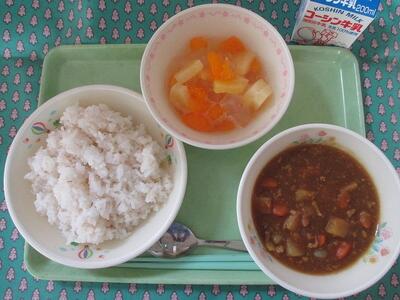 4月18日 牛乳 あめ色玉ねぎ入りポークカレーライス フルーツ寒天和え