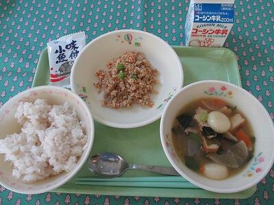 5月30日 牛乳 麦ご飯 五目鶏そぼろ丼の具 餅入りたぬき汁 味付け小魚