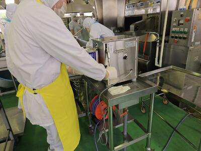 缶詰は全部で大きいサイズが160缶です。電動の缶切り機であけています。今日は4300人分この写真2つ分のあじさいポンチを作っています。