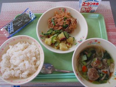 千葉県では,千葉県でとれた食材をその地で食べることを千産千消と呼んでいます。今日は千葉県でとれた,豚肉・小松菜・大根・しいたけ・ねぎ・のり・米・牛乳を使用しました。また,千葉県の郷土料理「鰯のつみれ汁」です。銚子産の鰯と鯖を使っています。千葉の恵みの給食です。