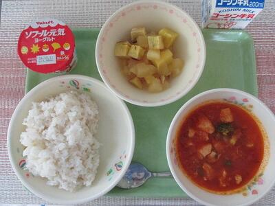 9月27日 牛乳 麦ご飯 鶏肉と野菜のトマト煮込み(ポジョ・アルベハド) 蒸しさつま芋とりんごのレモンソースがけ ヨーグルト