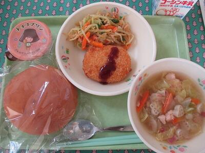 2月14日 牛乳 丸パン(横スライス)豆乳コロッケ(ソース) もやしのカレー風味サラダ キャベツとベーコンのスープ バレンタインデザートチョコプリン