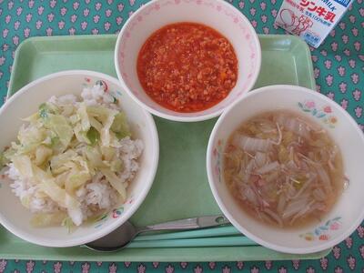 2月16日 牛乳 タコライス(麦ご飯・タコミート・キャベツ) 白菜とハムのスープ(寒天入り)