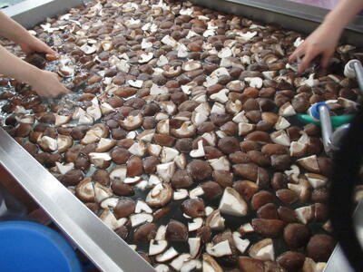 水でこねた小麦粉を薄くのばした生地で手でちぎって煮ることから,「ひっつみ」は「手でちぎる」の方言「ひっつまむ」がなまってこうよばれるようになりました。今日のひっつみは,米粉で作ったのでつるっとしている食感です。汁の中には,佐倉きのこ園でとれた生しいたけが入っています。干し椎茸よりくせがないですが,味がでていますよ。
