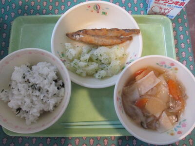 2月22日 わかめご飯 ししゃものから揚げ(2本) 磯ポテト ひっつみ汁