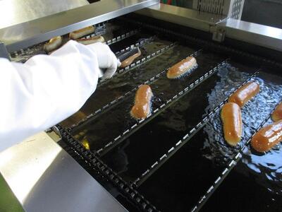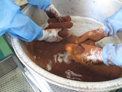 ココア揚げパンは,リクエストの多かったメニューの1つです。今日は4400個のパンを1つ1つ油で揚げてからココアと砂糖をまぶしています。