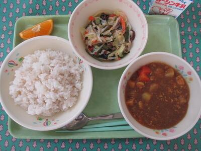 2月27日 牛乳 チキンカレーライス 梅ドレッシングサラダ いよかん