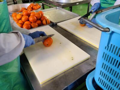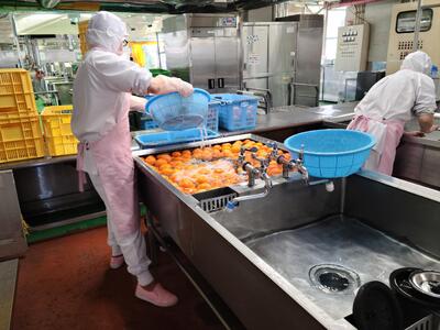 いよかんは全部で750個をていねいに洗ってから,2人の調理員さんで切って各クラスに配っています。