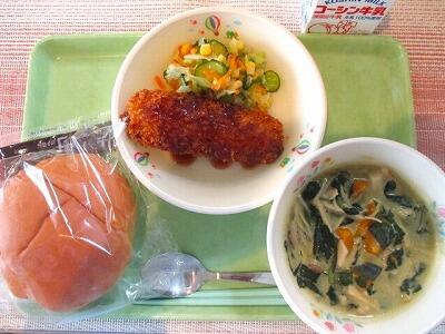 10月23日 牛乳 ロールパン チョコクリーム いかフライ(ソース) コーンサラダ かぼちゃときのこの豆乳スープ