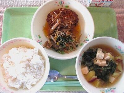 10月24日 牛乳 ご飯 ハンバーグ和風きのこだれ ごぼうのごま和え さつま芋の味噌汁