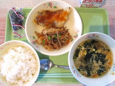 10月25日 牛乳 ご飯 ホキの甘酢あんかけ 五目金平 かきたま汁 ドライプルーン