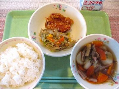 10月28日 牛乳 ご飯 鶏肉の唐揚げ ごぼうとキャベツのお浸し 豚肉と大根のすいとん汁