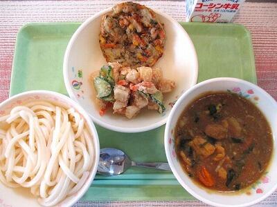 10月29日 牛乳 カレーうどん(うどん) ひじきのかき揚げ じゃが芋のごま酢和え