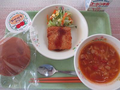 2月5日 牛乳 丸パン(横スライス) 白身魚のフライ(ソース) コールスローサラダ ミネストローネスープ アセロラゼリー