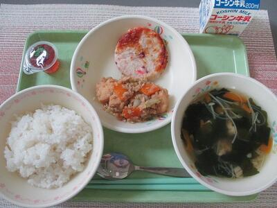 7月1日 牛乳 ご飯 たこ入りすり身焼き 生揚げとキャベツの味噌炒め 春雨とわかめのすまし汁 ひとくちぶどうゼリー