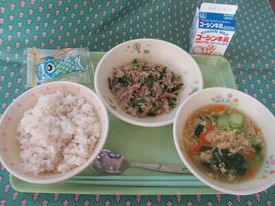 5月5日はこどもの日ですが,端午の節句とも言います。しょうぶ湯に浸かったり,こいのぼりやかぶとを飾ったりします。みなさんの健やかな成長を願って,柏餅を出しました。また,新年度の疲れがとれるように,スタミナがつく「にら入り豚丼」にしました。
