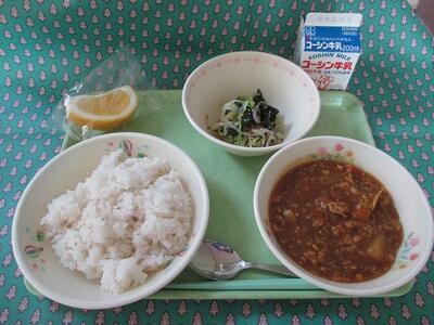 5月15日 牛乳 ポークカレーライス(麦ごはん) レタス入りわかめサラダ 河内晩柑