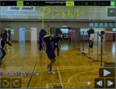 | 活用1 | iPad「CMV」のアプリで自分の打っている動作を撮影し、肘の角度や打点などをコマ送りやスローモーションで確認する。 |
