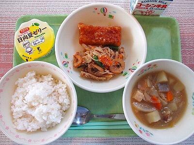 4月22日 牛乳 ご飯 いかのかりん揚げ たけのこのおかか煮 豚汁 日向夏ゼリー