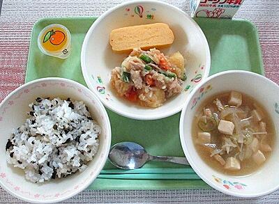 4月23日 牛乳 わかめご飯 厚焼き卵 肉じゃが 豆腐と油揚げの味噌汁 ひとくちみかんゼリー