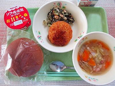 4月24日 牛乳 丸パン(横スライス) ポークコロッケ(ソース) 大豆とひじきのサラダ ABCマカロニ入りスープ ヨーグルト
