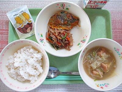 4月25日 牛乳 ご飯 鰆のカレー焼き 五目きんぴら 春キャベツの味噌汁 スナックアーモンド