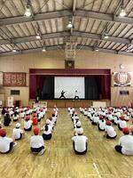 さて,昨日は一年生を迎える会を行いました。今年度は,体育館に全校が集まっての開催となりました。