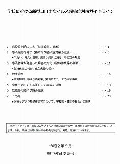 そこで,柏市教育委員会では,「学校における新型コロナウイルス感染症に関する衛生管理マニュアル~『学校の新しい生活様式』~(2020.5.22Ver.1)」及び「新型コロナウイルス感染症 学校における感染対策ガイドライン(令和2年5月18日版)」を参考に柏市版のガイドラインを作成いたしました。本校の教育活動も,これに準じて実施して参ります。
