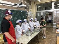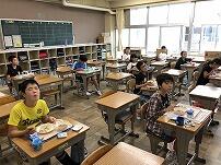 給食当番はマスクとフェイスシールド着用で配膳を行いました。