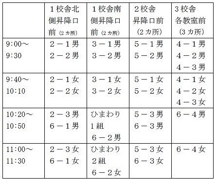 各学年の「プリント等配付日」の配付時間と場所については,以下のとおりです。