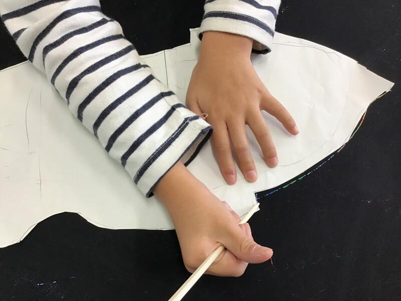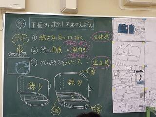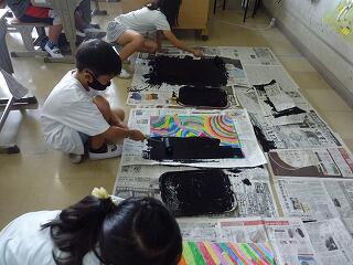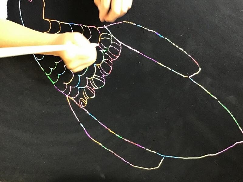 2年生の図工では,虹色の魚という題で,スクラッチの技法を使って魚の絵をかいています。これまでに,クレヨンを使ってカラフルに塗った画用紙を,黒いアクリル絵の具で上から塗ってあり,今日からそれを削って魚の絵を描いていきます。