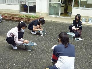第6学年は,家庭科「すずしく快適に過ごす着方と手入れ」で洗たくの学習をしています。もみ洗いやつまみ洗いを学び,靴下についた泥汚れを一所懸命に落としていました。