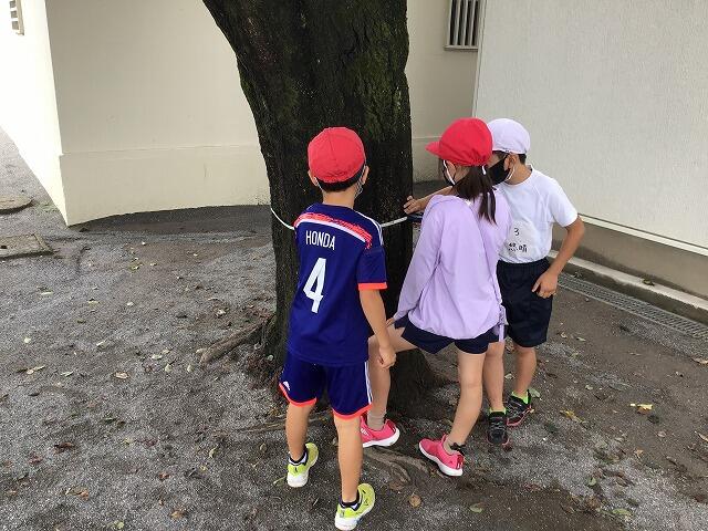 算数の「長い長さをはかって表そう」において,校庭でいろいろなものの長さを巻き尺を使って測りました。0の目盛りに正しく合わせたり,巻き尺をぴんとはったりして,協力して活動することができました。