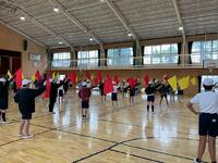 朝から体育館に電気がついていたので,どうしたのかと覗いてみたら…6年生の先生たちがフラッグの朝練習をしていました。みんなからのアイディアが形になってきているそうです。4時間目の練習ではその姿が見えてきました