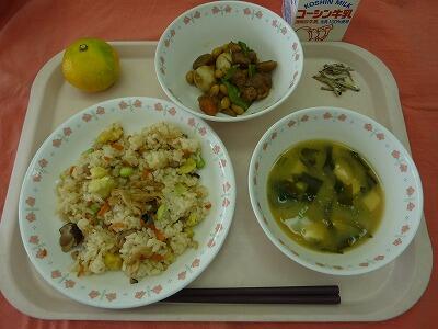 一覧へ 今日の給食 日時 2024年10月15日(火) 公開対象 給食室 詳細 ・牛乳 ・吹き寄せご飯 ・大豆と豚肉の甘辛煮 ・じゃがいものみそ汁 ・みかん ・小魚 作成者 柏第二小学校管理者 更新日時 2024-10-15 12:07:29