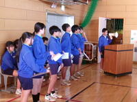 大掃除後,着替えて廊下に整列し,終業式が行われる体育館に移動しました。終業式前に,1学期終業式以降から本日までに表彰された団体・個々人の,表彰紹介が行われました。