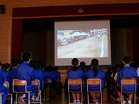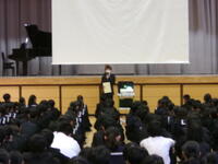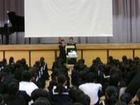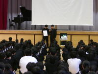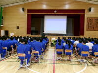 全校生徒が体育館にて麻生先生のお話を聴く計画でしたが,2年生に感染症の生徒が出始めましたので,感染予防策として,2年生は各教室にて,体育館で投影されている資料を共有しました。
