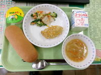 今学期最終の給食は,コッペパン,鶏肉のパリパリ焼き,かぶとブロッコリーのツナサラダ,マカロニとレンズ豆のスープ,はちみつレモンゼリーでした。かぶとブロッコリーのツナサラダはブロッコリーの緑がクリスマスツリーを連想させ,コーン(黄色),人参(橙色),かぶ(白)がツリーを飾る飾りのようでした。はちみつゼリーは,一足早い,栄養士さんからのクリスマスプレゼントだったのでは,と思いました。来週から冬休み含め,昼食は各ご家庭にて,よろしくお願いいたします。