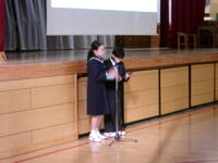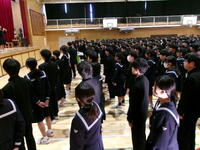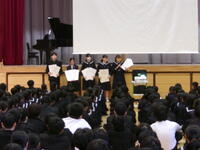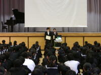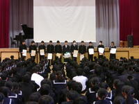 表彰紹介ののち終業式へと移り,学校長の話,生徒会を代表して「柏市いじめ防止サミット」に出席した2名の生徒から「いじめ防止サミット」を振り返るとともに,今後生徒会としていじめ防止に取り組んでいくことを伝え,最後に生徒指導主任よりSNS利用に際しての注意点,交通事故に遭わないこととあわせ,加害者にもなり得る自転車の利用について,最後にお金を手にしやすい冬休み,しっかりお金を管理するよう伝え,終業式が終了しました。