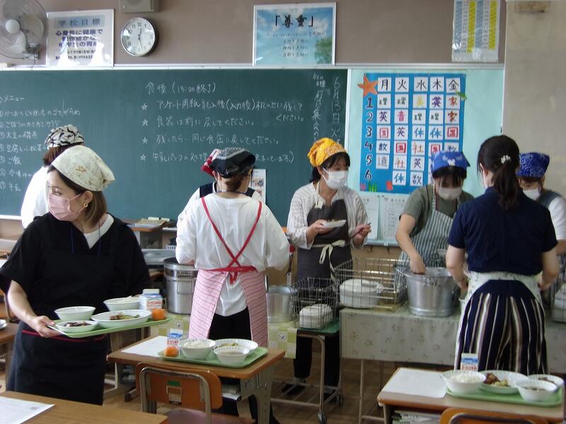 PTA学年委員の皆様に配膳準備をしていただき、給食の試食を行いました。